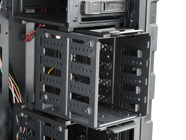 L’Ostrog GT è in grado di ospitare fino a 10 dispositivi di memorizzazione dati: Enermax fornisce due gabbie per l'installazione di otto HDD da 3,5 " e una gabbia mobile per due SSD / HDD da 2.5". Nel caso in cui gli utenti desiderino installare schede grafiche di fascia alta, la gabbia HDD inferiore può essere rimossa. In questo modo, il case supporta schede video con una lunghezza massima di 412,5 millimetri. I designer di Enermax hanno pensato anche ad un disaccoppiamento efficace degli HDD installati: cuscinetti di gomma sulle slitte per HDD riducono al minimo le vibrazioni. Infine, per i backup o il trasferimento di dati, l’Ostrog GT è dotato di due porte USB 3.0 nella parte superiore.