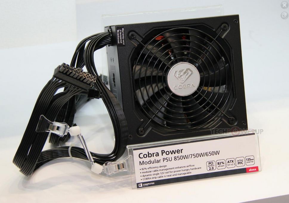 Oltre ai cabinet e ai dissipatori, Akasa rilascia informazioni sulla nuova linea di alimentatori CobraPower, che saranno disponibili con i wattaggi 650-750 ed infine 850W. Offrono una efficienza dell'82% (non è ancora stata accettata la certificazione 80plus ma è questione di tempo), sono modulari con connettori piatti, ovviamente è presente la (Active) Power Factor Correction, design single rail per la +12V ed una grande ventola da 135mm.