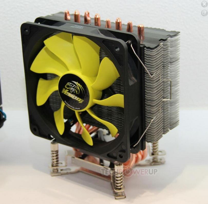 Dopo tutto questo, Akasa mette in mostra il dissipatore Venom IV. Classiche alette in alluminio con un design asimmetrico, quattro heatpipe da 6 mm in rame perfettamente ripartite nel radiatore in senso orizzontale, ed una ventola da 120mm della serie Viper. Questo è interessante, perché entro brevissimo la vedrete in azione nel nostro quarto roundup delle ventole su di un Thermalright TRUE Copper. Il dissipatore sembra particolarmente economico, ma data la qualità di questo produttore certamente sarà più che adeguato per overclock discreti. Compatibilità confermata per i socket LGA115x, LGA1366, LGA2011, AM3+/AM3, and FM2/FM1.