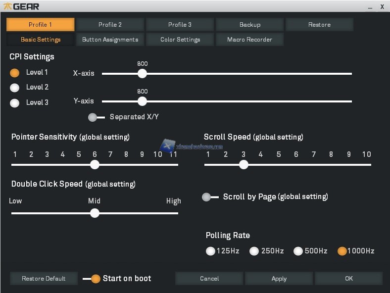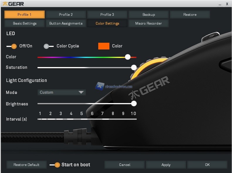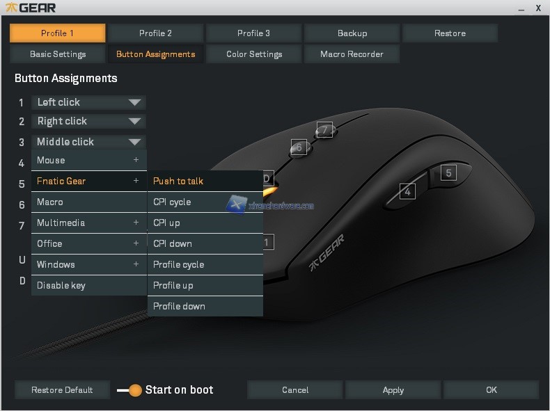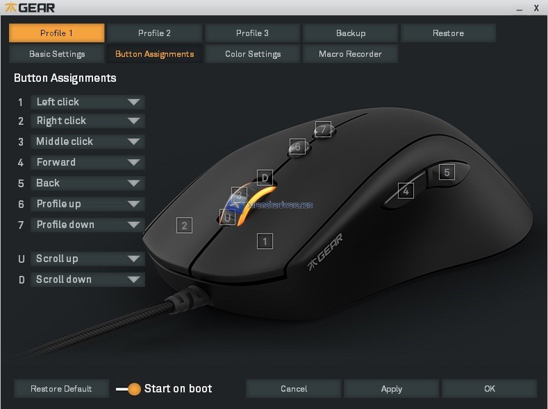 Nella parte alta troviamo i 5 Profili che potremo personalizzare da tale software di gestione e alcune voci che ci permetteranno di effettuare un Backup, un Restore dei profili salvati, un ripristino ai parametri di fabbrica in caso di problemi e i classici tasti per confermare o meno le modifiche.